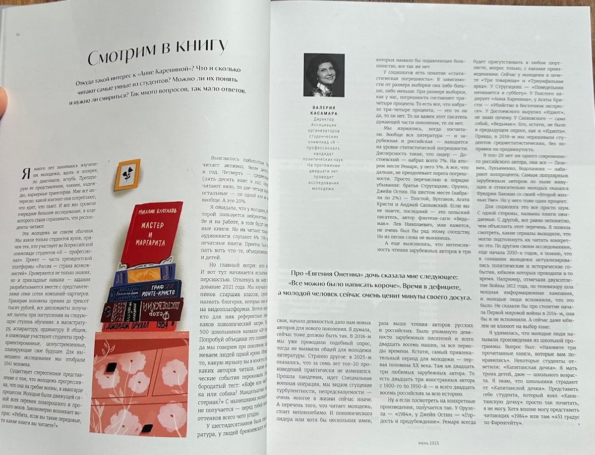 Наткнулась на любопытную статью Валерии Касамары в журнале "Москвичка" №6/2025 о читательских предпочтениях студентов-участников Всероссийской олимпиады "Я - профессионал". Валерия занимается исследованиями молодежи и для подготовки статьи использовала собственноручно собранную статистику. В первой части поста вы узнаете, что собственно читают наши "умные" студенты или... говорят, что читают :) А во второй - мои мысли по поводу статьи В. Касамары. Имя автора мне сразу показалось знакомым, но изучение ее биографии вспомнить где и в каком качестве я с ней сталкивалась ранее, не помогло. Может быть, вы с ней сталкивались где-то в инфопространстве?