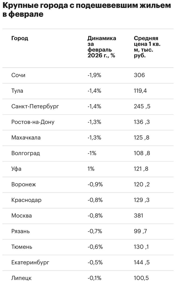 После ажиотажа на рынке недвижимости в конце прошлого года цены начали постепенно корректироваться. Февраль показал довольно неожиданную динамику: число крупных городов, где подешевело вторичное жилье, резко выросло. Если в январе снижение фиксировалось всего в трех из 50 крупнейших городов России, то уже в феврале таких городов стало 15. То есть квартиры подешевели почти в каждом третьем крупном городе страны. Такие данные приводит «РБК Недвижимость» со ссылкой на аналитику консалтинговой компании SRG. Лидером по снижению стоимости жилья стал Сочи. Там квадратный метр за месяц подешевел на 1,9% и сейчас стоит около 306 тысяч рублей. Далее идут: В остальных городах снижение оказалось менее заметным — от 0,1% до 1%. Интересно, что даже Москва попала в список городов с падением цен. В столице вторичное жилье за месяц подешевело на 0,8%, а средняя стоимость квадратного метра сейчас составляет около 382 тысяч рублей. Эксперты считают, что речь идет не о начале обвала цен, а о естественной