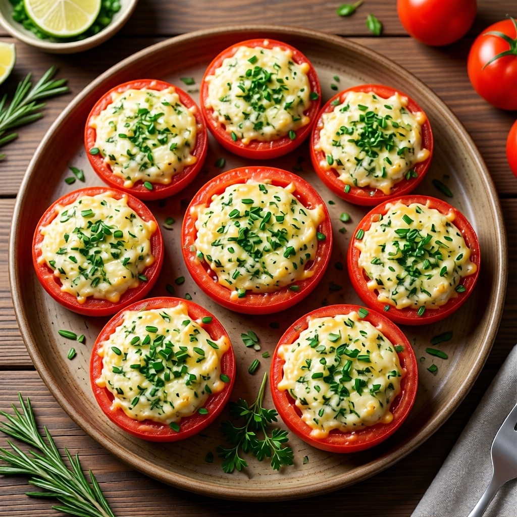 Запеченные: Если хотите более сытный вариант, можно поставить начиненные помидоры в разогретую до 180°C духовку на 10-15 минут. Сыр расплавится, а помидоры станут еще мягче.