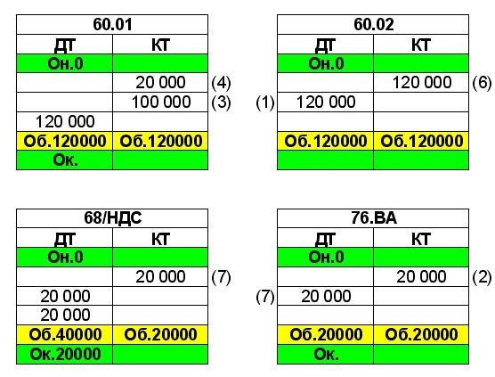 - Дебет 19 Кредит 60/01-20 000 рублей (120000/120*20)-Отражен НДС по приобретенным товарам.