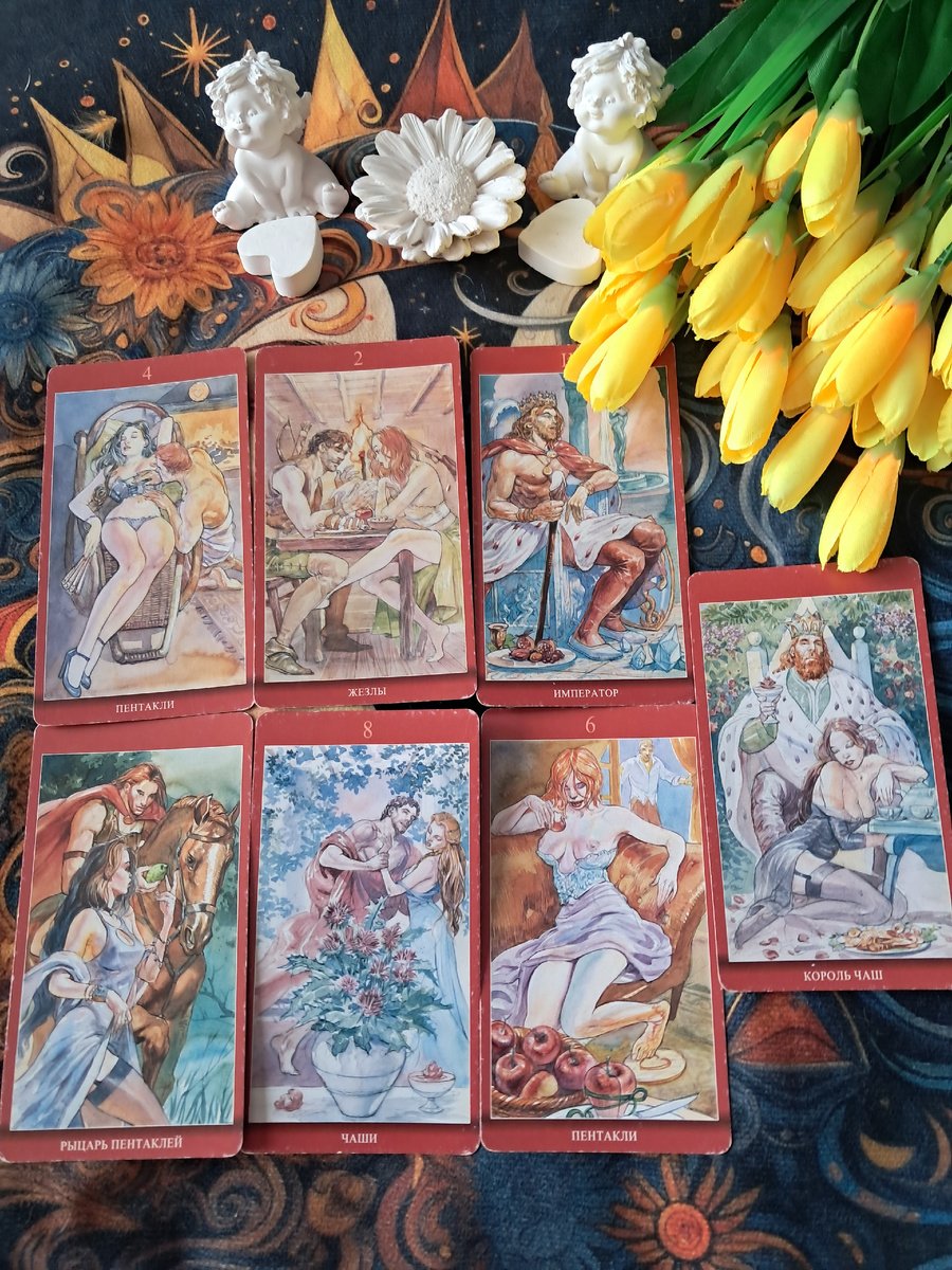 Карты показывают, что ты сейчас окружена вниманием, пусть не всегда явным. Самое главное — доверять своей интуиции. Тот самый Король Чаш уже где-то рядом или скоро появится. Ты притягиваешь достойных людей, потому что сама излучаешь внутреннюю гармонию (помни про 8 чаш — важно не уходить в иллюзии, а смотреть на реальных людей с открытым сердцем).