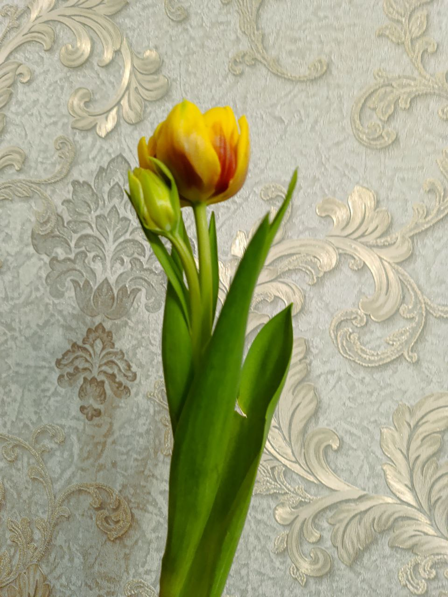 Дни шли, бутоны наливались цветом — они оказались ярко‑жёлтым, как солнышко. И вот, накануне 8 Марта, оба бутона начали раскрываться. Сначала распустился большой цветок — гордый, красивый, с ровными лепестками. А на следующее утро, словно дождавшись праздника, раскрыл свои лепестки и маленький. Он был чуть светлее, чуть нежнее, но так же радостно тянулся к свету рядом с «мамой».
