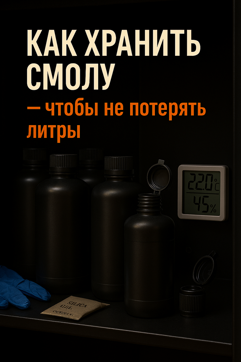 Привет! Это команда SmolArt. За последние 2 года я испортил больше 4 литров смолы просто потому, что неправильно её хранил. Сейчас у меня есть чёткий режим — и смола живёт 12–18 месяцев без потери свойств (усадка, прочность, цвет остаются как в день покупки). Вот мой текущий чек-лист хранения (март 2026). 1. Температура — самое важное 2. Свет — главный враг 3. Влажность и воздух 4. Бутылка и крышка 5. Сколько можно хранить 6. Что делать, если смола постояла долго Если хранить правильно — смола живёт в 2–3 раза дольше, чем пишут на этикетке. А как ты хранишь смолу?