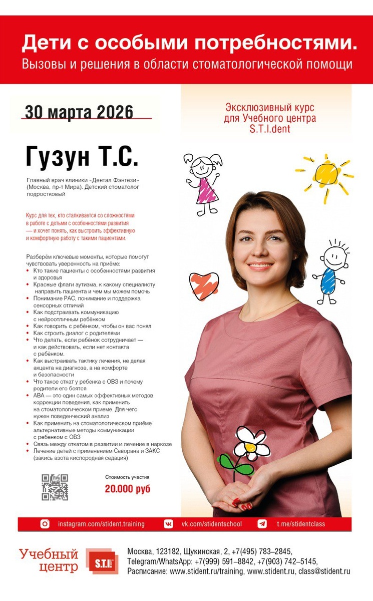 Как выстроить коммуникацию, чтобы ребёнок услышал вас, а родители доверились? На курсе мы будем говорить о том, как 👉 • распознавать красные флаги СДВГ и других нейроотличий у детей; • понимать, когда важно направить к смежному специалисту; • выстраивать диалог с родителями без давления и страха; • как действовать, если ребёнок не вступает в контакт; • взвешенно подходить к вопросам наркоза и седации, понимая возможные последствия и риски, Подробнее о программе можно прочитать по ссылке https://stident.ru/training/26216632/ Для меня это не просто курс про «особенных» пациентов. Я считаю, что это моя миссия — рассказать и показать, как можно не давать оценку ни родителям, ни пациентам