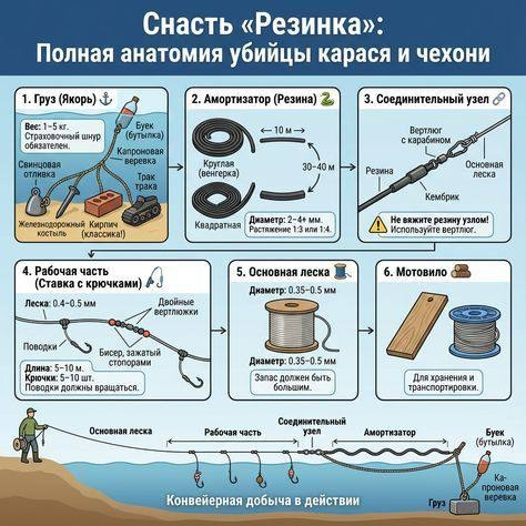 🪢 Обязательно страховочный шнур, чтобы не потерять снасть при обрыве резины
