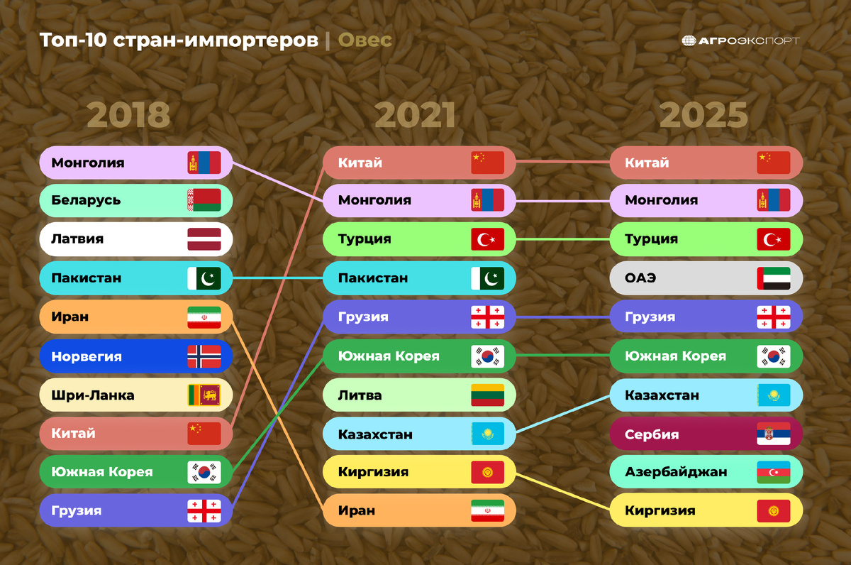 📊 В 2025 году валовой сбор овса в России составил 3,8 млн тонн — это на 25,8% больше, чем в 2024-м. Вырос и экспорт в стоимостном выражении: в 2025 году Россия поставила на зарубежные рынки более 280 тыс. тонн овса на сумму почти 62 млн долл. США. Тем самым был обновлен исторический максимум в стоимостном выражении, установленный в 2024 году, — 59,3 млн. долл. США. За 2018–2025 годы объем экспорта в натуральном выражении вырос в 4,8 раза, а максимум в весе пришелся на 2024 год — 309 тыс. тонн. При этом интересно, изменились ли направления поставок этой продукции за последние годы и открылись ли новые рынки для экспорта. На графике представлены: ✅ Основные страны-импортеры овса из России в натуральном выражении; ✅ Самые динамично растущие рынки; ✅ Новые перспективные направления экспорта. Если вы планируете экспортировать продукцию АПК, рекомендуем обратиться за бесплатной комплексной поддержкой в «Агроэкспорт». Наши персональные менеджеры помогут на всех этапах — от анализа рынка до в