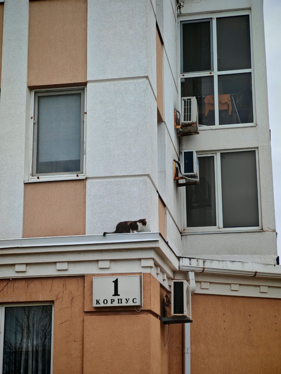 ЖК "Бельведер", Таманская, 121, корпус 1: гуляет серый кот по карнизу, видимо, домашний - упитанный, спускаться боится. Выпрыгнул может у кого-то из окна. Владельцы котика, обратите внимание! Новости Анапы в MAX