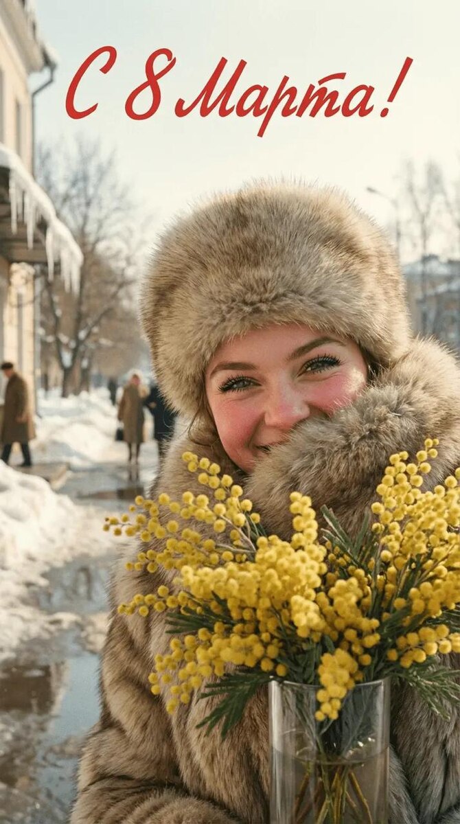 Модель: Nano Banana Сгенерировать🪄 Используй лицо девушки с загруженного фото. Сохранить внешность. Лицо очень реалистично. Стиль: открытка-натюрморт с портретом, стиль 1970-х. 9:16, 8K, легкая винтажная дымка. Вверху надпись красным курсивом: «С 8 Марта!». Надпись на русском языке без ошибок. Композиция: На переднем плане — пушистая веточка мимозы в стеклянной вазе или просто в руках. На заднем плане — лицо девушки. Она выглядывает из-за ветки. Образ: Девушка в меховой шапке или пушистом воротнике, щеки нарумянены морозом. Лицо видно полностью. Макияж: акцент на глаза, они сияют. Поза: Она прикрывает нижнюю часть лица воротником, видны только глаза и лоб. Взгляд веселый, искрящийся. Фон: Заснеженная, но уже тающая улица, капель. Символизм: мимоза и весна приходят даже в мороз.