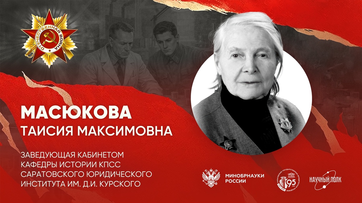 У войны не женское лицо… Но сколько же женских лиц она навсегда запечатлела в нашей памяти – решительных, отважных, полных мужества и силы! В преддверии 8 Марта мы вспоминаем тех, кто не просто пережил войну, а встал на защиту Родины наравне с мужчинами, пожертвовав юностью, мечтами, собой. Сегодня мы расскажем историю Таисии Максимовны Масюковой, заведующей кабинетом кафедры истории КПСС СЮИ им. Д.И. Курского (ныне – СГЮА). Ее подвиг – часть великой летописи Победы. Масюкова Таисия Максимовна родилась 30 декабря 1923 года в с. Высочаны Витебской губернии, обучалась в средней школе г. Саратова. В июле 1941 года Таисия Максимовна ушла добровольцем на фронт. Призывалась Кировским РВК г. Саратова. С великой грустью и со слезами на глазах она вспоминала те события: «В июне 1941 года я жила, как и многие из моего поколения, недавним счастьем школьной жизни, мы были убеждены в слабости Германии, в своей скорой победе. Сегодня я хорошо знаю, что чистота, наивность и романтизм стоили миллионов