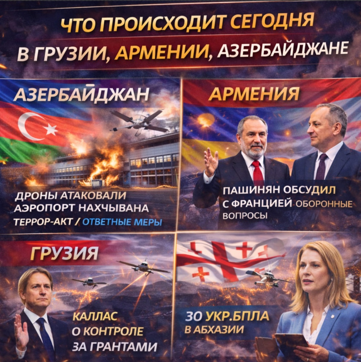 Азербайджан Ключевым событием стала атака БПЛА по объектам на территории Нахчыванской автономной республики. Один БПЛА упал на здание терминала Нахчыванского международного аэропорта, второй — в селе Шекерабад. Иран свое участие в нахичеванском инциденте отрицает. Баку квалифицировал произошедшее как террористический акт, вызвал посла Ирана в МИД и заявил о праве на ответные действия в соответствии с нормами международного права. Президент И.Алиев немедленно созвал заседание Совета безопасности. По его словам, вооружённые силы Азербайджана переведены в полную боевую готовность. При этом Алиев подчеркнул, что Азербайджан не участвует и не намерен участвовать в операциях против Ирана, однако ответственность за удар должна быть возложена на иранскую сторону. В качестве дополнительной меры кабинет министров приостановил движение грузовиков через азербайджано-иранскую границу. Инцидент получил международный резонанс. Премьер-министр Албании Эди Рама публично призвал рассмотреть вопрос о при