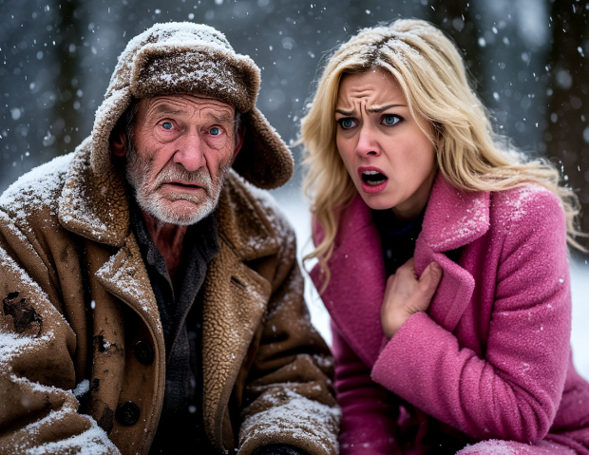 Лежит старик в снегу. Маленький, худой, в старом тулупе. Руки трясутся, губы синие. Продукты валяются рядом, заметает их снегом. И смотрит на неё так... беспомощно.