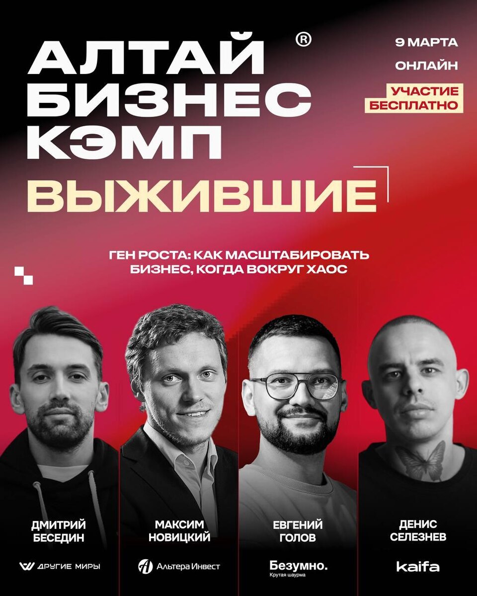 ] Когда вокруг хаос, а ты всё еще не закрылся — это достойно статуса «Выживший» Мы активно готовимся к нашему АЛТАЙ БИЗНЕС КЭМПу и решили запустить серию бесплатных онлайнов. Наша цель — дать участникам «пробник» того мощного контента, который будет на Алтае, и собрать аудиторию, которая готова расти вопреки всему 🔥 Формат простой: 30 минут на каждого эксперта. Задача каждого спикера — дать один твердый алгоритм или инструмент, который вы сможете внедрить в свой бизнес уже на следующий день, чтобы подправить процессы, улучшить показатели или начать масштабный рост. Тема первого эфира: «ГЕН РОСТА: Как масштабировать бизнес, когда вокруг хаос» Поговорим о франчайзинге, найме и продажах. Наши спикеры: Максим Новицкий — Основатель «Альтера Инвест» (крупнейший брокер готового бизнеса в РФ). Выпускник «Сколково», автор книги «Покупка готового бизнеса». Дмитрий Беседин — Сооснователь и CEO франшизы сети арен виртуальной реальности Another World, насчитывающей 470 точек в 55 странах.