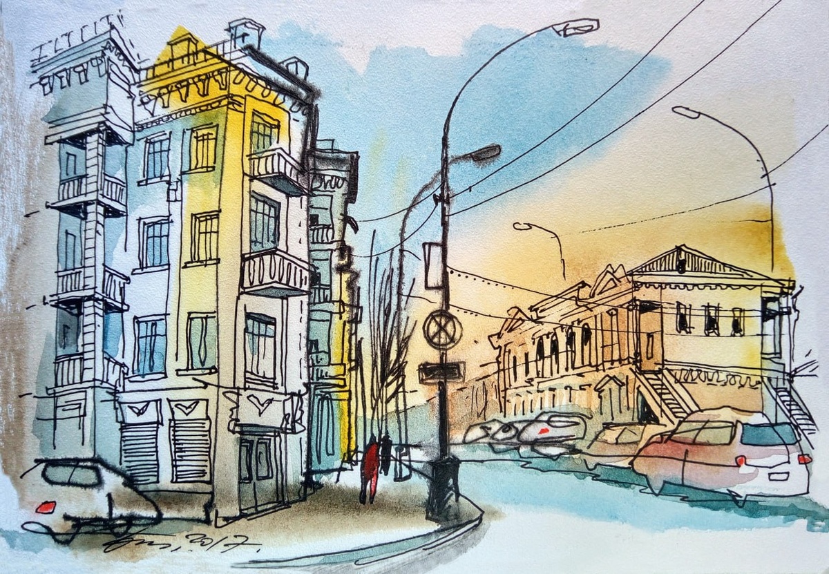 Лето 17-го года на Першпективной перо, акварель 15х20 см, 2017 г