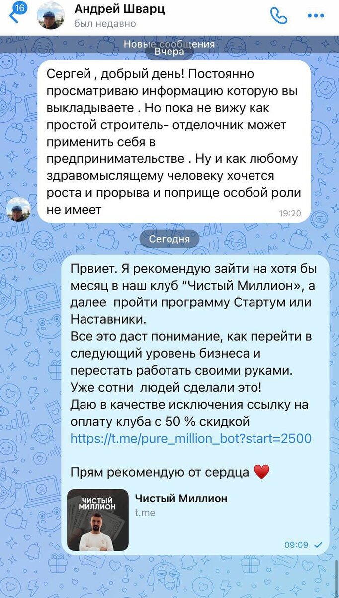 ». Дарю возможность зайти в клуб со скидкой 50% + по этой же ссылке вас ждет еще и бонусное видео «Система «НЕДЕЛЯ РЕЗУЛЬТАТА»: Как за 7 дней увидеть реальный прогресс в бизнесе» Забирайте тут: https://t.me/pure_million_bot?start=2500