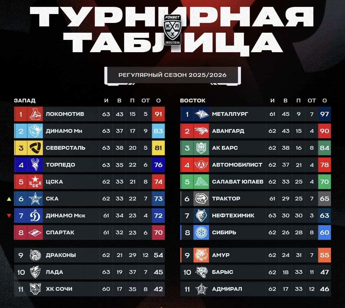 🏒Турнирная таблица КХЛ🏒
