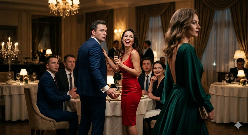 Лена шагнула в зал. Свет массивной хрустальной люстры мгновенно выхватил ее из полумрака прихожей. Изумрудный шелк переливался при каждом ее движении. Она шла медленно, уверенно, с гордо поднятой головой, отбивая четкий ритм каблучками по мраморному полу. Ее взгляд, спокойный и слегка ироничный, скользил по присутствующим.