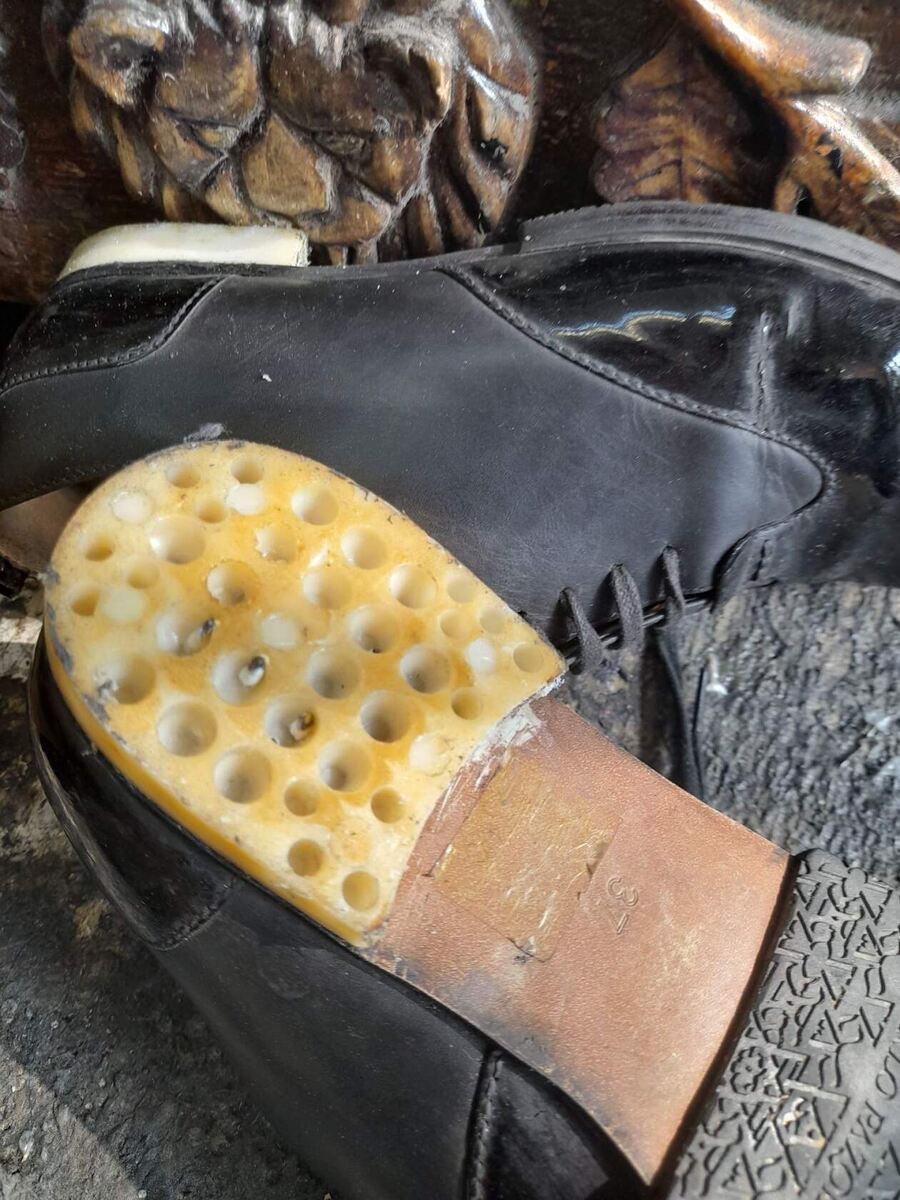 Оценка состояния каблука: Сапожник осматривает каблук, определяет степень износа и выбирает подходящий тип набоек.