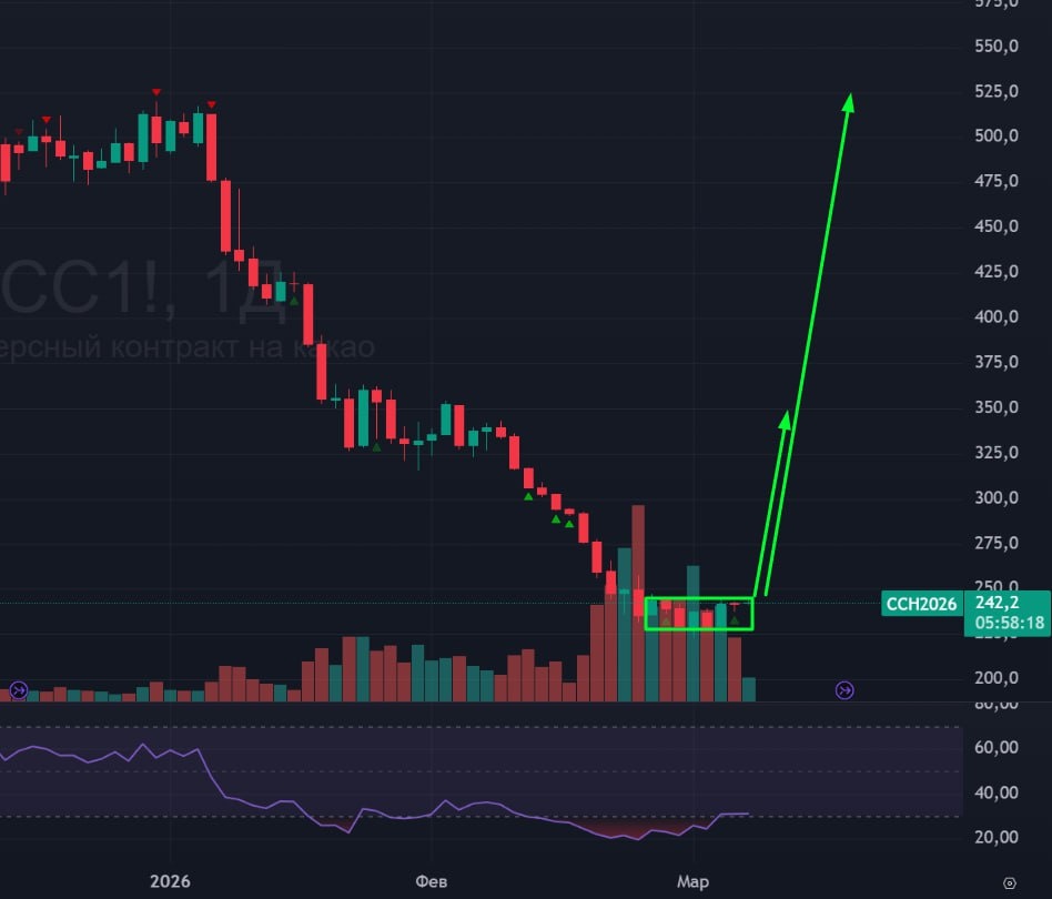🟢 Если в кофе уже пошел разворот, но в какао его все еще нет. Цена стоит в накоплении и из него не вышла. Тут пока ожидания не меняются - жду разворотный сетап и разворотные свечки. 🚗 Жду какао вверх: цели - 256 как подтверждение разворота, потом 350 и 525. #какао #cc1 #cocoa #bogdanoffinvest $CCH6 $CCJ6