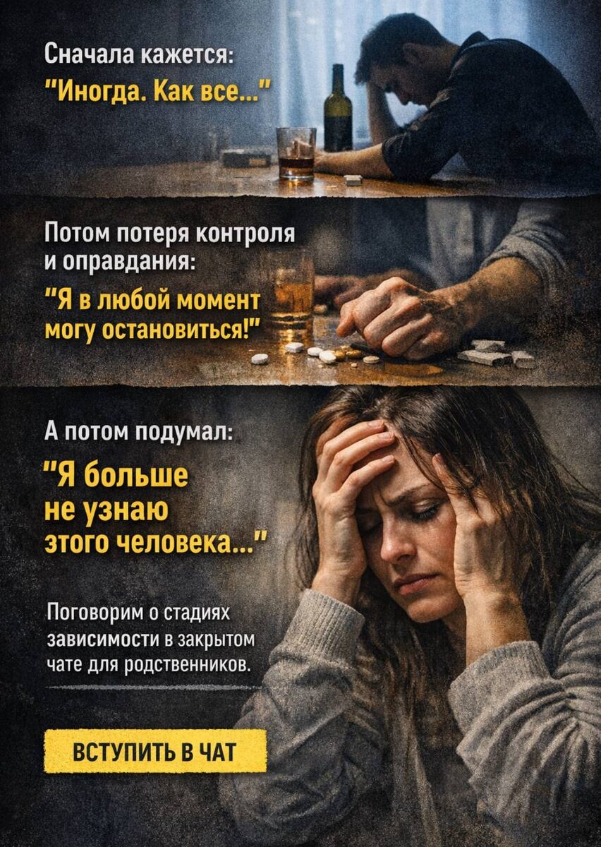 ». Сначала это выглядит безобидно: «Иногда», «по праздникам», «как все». Потом появляются мелкие тревожные звоночки. Потом - оправдания. Потом - потеря контроля. А однажды родственники ловят себя на мысли: «Я больше не узнаю этого человека…» Но сам зависимый в это время чаще всего говорит: «У меня всё нормально» «Я в любой момент могу остановиться» «Вы всё преувеличиваете» Это называется отрицание. И это одна из стадий развития зависимости. На этой неделе в нашем закрытом чате для родственников мы разбираем тему: «Стадии развития зависимости» Вы увидите: это не хаос и не «только в нашей семье». У зависимости есть закономерности, через которые проходят тысячи семей. Когда начинаешь это понимать, то появляется ясность и становится чуть легче. Наш закрытый чат это место для тех, кто живёт рядом зависимостью. Где можно говорить честно. Без стыда. Без осуждения. Если вам откликается, то присоединяйтесь к чату поддержки. Чтобы попасть в чат - напишите @AleksandrShadrin