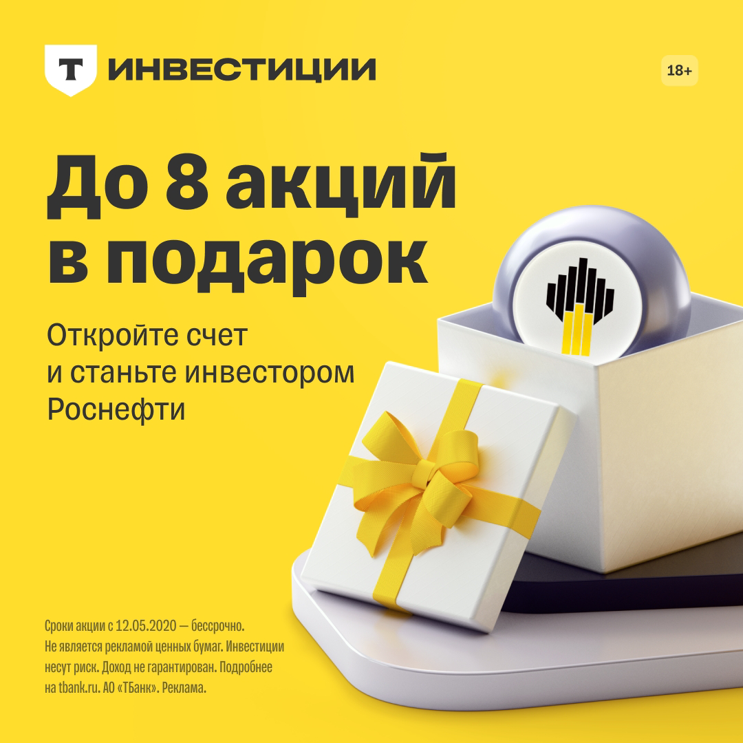Откройте счет и получите до 8 акций «Роснефти» в подарок. Это способ сразу начать с реальных ценных бумаг и почувствовать, как работает рынок.