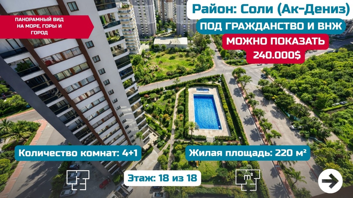 🔥 🇹🇷 ПОД ВНЖ ПО ТАПУ 100% (МОЖНО ПОКАЗАТЬ 240.000$) 🏢 ЖК ПРЕМИУМ-КЛАССА 🌊 ПАНОРАМНЫЙ ВИД НА МОРЕ, ГОРЫ И ГОРОД 📍 Основные параметры: ▪️ Район: Соли (Ак-Дениз) ▪️ Количество комнат: 4+1 ▪️ Жилая площадь: 220 м² ▪️ Этаж: 18 из 18 (два лифта) ▪️ Санузел: 2 душа, 2 туалета ▪️ Особенности: гардеробная комната, прачечная + кладовая ▪️ Отопление: газ активный ▪️ Терраса: +14 м² ▪️ Тех. балкон: +5,8 м² ▪️ Вид: панорамный (море, город, горы) ▪️ Возраст дома: 7 лет ✅ Богатая инфраструктура (Premium): — Открытые бассейны 🤽♂️ — Крытый зимний бассейн 🏊♂️ — SPA: Сауна и Хамам 🧖♂️🧖♀️ — Баскетбольная площадка 🏀 — Детская игровая площадка — Зоны барбекю и беседки для отдыха — Зелёная зона для прогулок, Лобби — Автостоянка, Генератор, Охрана 24/7, Видеонаблюдение — До пляжа: 999 метров 🏖 — В шаговой доступности: рынки, маркеты, кафе, школы, ТЦ, транспорт 📄 Искан есть 💻 Доступна онлайн бронь и оформление сделки 🆔 ID1436ram 💰 ЦЕНА: 158.000€ / 187.000$ ✅ Подходит под Гражданство Тур