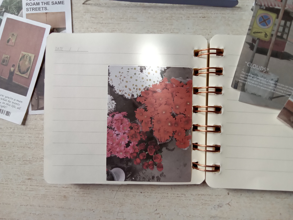Лежало около меня много листочков бумаги для скрапбукинга с разными изображениями. Было желание оформить страничку в блокноте, но не было никаких идей.