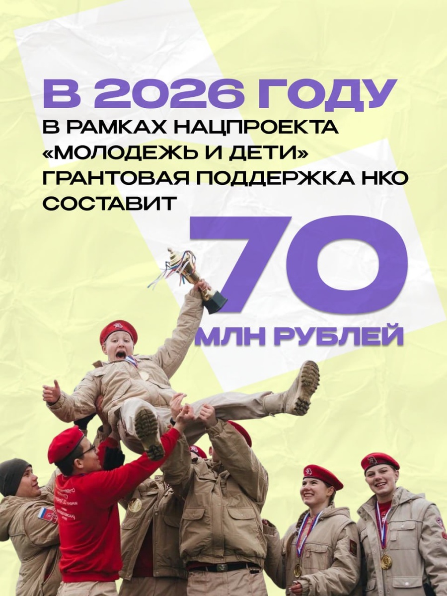⚡️ ✅ Стартовал приём заявок на конкурс Росмолодёжь.Гранты на реализацию мероприятий по сохранению исторической памяти и гражданскому воспитанию. Участвовать в конкурсе могут НКО, в том числе молодёжные и детские общественные объединения (за исключением казенных учреждений), зарегистрированные не позднее чем за 1 год до проведения конкурса. Заявки принимаются до 2 апреля ❗️ 🗣 «Благодаря включению конкурса Росмолодёжь.Гранты в национальный проект «Молодёжь и дети» с прошлого года увеличилась максимальная сумма гранта. НКО могут претендовать на получение до 2,5 млн рублей, что на миллион рублей больше, чем в 2024 году. Общий объём грантовой поддержки в 2026 году составит 70 млн рублей. Это позволит масштабировать проекты по продвижению наших духовно-нравственных ценностей, популяризации спорта, безопасности и многого другого», – заявил Дмитрий Чернышенко. 👉 Все подробности, номинации и подача заявок на сайте – https://vk.cc/cV3zGF Не упусти возможность получить поддержку для своей