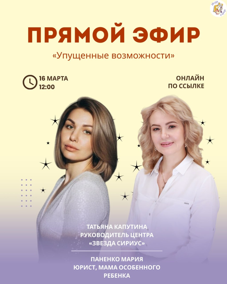 Сомнения, страхи и откладывание визита к специалисту меняют формирование способностей ребенка. Родители боятся услышать диагноз и не оказывают помощь вовремя. К чему это приводит? Разберем истории из жизни в прямом эфире. 🗓16 марта в 12:00 🔗 Подключиться по ссылке: https://my.mts-link.ru/j/160288359/15194560384 📌Тема: «Упущенные возможности» ☀️Спикеры: Паненко Мария, юрист, мама особенного ребенка Капутина Татьяна, руководитель центра «Звезда Сириус» 💫Обсудим: • Своевременную диагностику. Почему раннее понимание изменений экономит время и ресурсы. • Медикаментозную поддержку. Разберем ситуацию, когда «таблетки» пугают меньше, чем последствия их отсутствия. • Эмоциональный барьер. Откуда берутся страхи? Как отделить объективные риски от тревоги и принять решение? ☘️Поможет родителям, которые: • откладывают визит к специалисту; • прошли часть пути и сомневаются в результате; • боятся медикаментозного лечения; • хотят услышать реальный опыт. Это разговор мам, которые проходят э