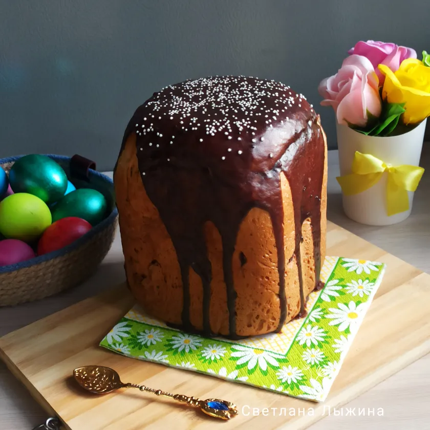 Кулич в хлебопечке с орехами и изюмом в шоколадной глазури