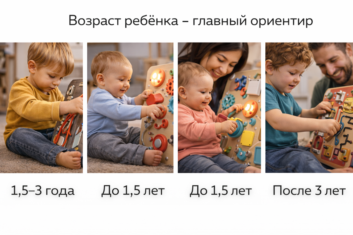 — «наш просто не любит такие игрушки». На самом деле причина чаще всего совсем другая. Бизиборд просто не совпал с возрастом ребёнка. Как детский психолог я часто вижу эту ситуацию на консультациях. Поэтому при выборе бизиборда советую смотреть не на количество элементов, а на три вещи: возраст, безопасность и интересы ребёнка. Дети проходят этапы развития моторики, и элементы на бизиборде должны соответствовать этим этапам. Ребёнок только начинает изучать предметы руками. Лучше всего подходят: — крупные шестерёнки