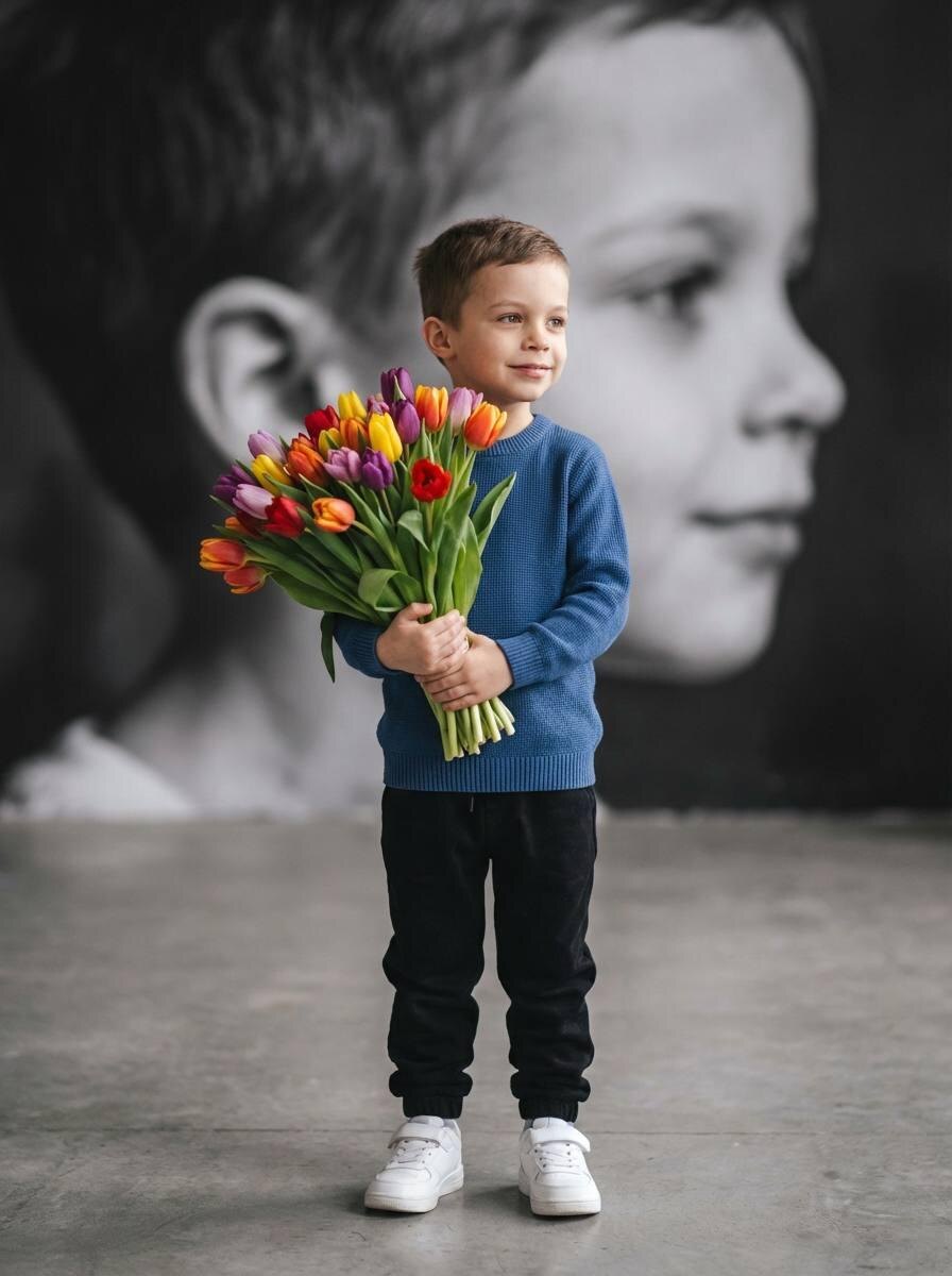 Модель: Nano Banana Сгенерировать🪄 СТРОГО сохранить черты лица 1:1 — пропорции, текстуру кожи, возраст, длину волос; фото — эталон. Вертикальное фото, полный рост ребёнка по центру кадра (~60% высоты), стоит прямо на сером бетонном полу, ступни параллельно, взгляд и голова повернуты слегка вправо, лёгкая улыбка. Одежда: однотонный синий вязаный свитер с круглым воротом, чёрные джоггеры со сборкой у щиколоток, стильные белые кроссовки. Реквизит: огромный букет ярких разноцветных тюльпанов в руках на уровне груди/живота, букет занимает ~30–35% кадра, не уменьшать. Руки обхватывают стебли двумя ладонями спереди. Фон: внутри помещения, за ребёнком огромный чёрно-белый настенный постер/мурал с крупным профилем его же лица, сильно размытый (bokeh), занимает почти весь фон; цветной ребёнок резко отделён от монохромного фона. Свет мягкий естественный, низкий контраст, без вспышки, нейтральная температура 4800–5200K, чистая экспозиция, лёгкая текстура, без ретуши. Keep the face, facial featur