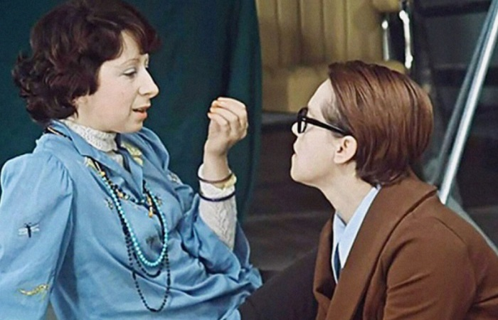 А джинсовый сарафан, похожий на фартук школьницы? Между прочим, абсолютно брендовая вещь с вышитыми на карманах кузнечиками. И на голубой блузе Верочки – тоже кузнечики, а еще – стрекозы и пчелы. И нет, это не детская вещь, и она не выглядела в 70-х смешно. Наоборот – подобная блуза и сарафан были предметом острой зависти для женщин, которые не сумели такого достать.