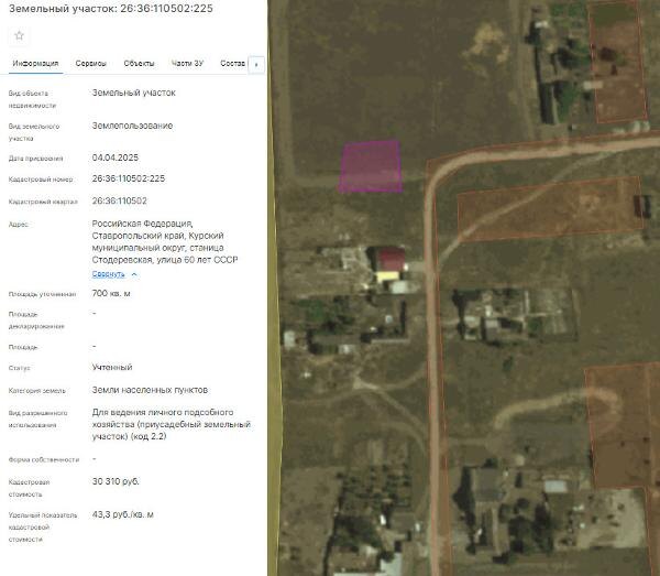 Название: Земельный участок с кадастровым номером 26:36:110502:225 площадь 700 по адресу Российская Федерация, Ставропольский край, Курский