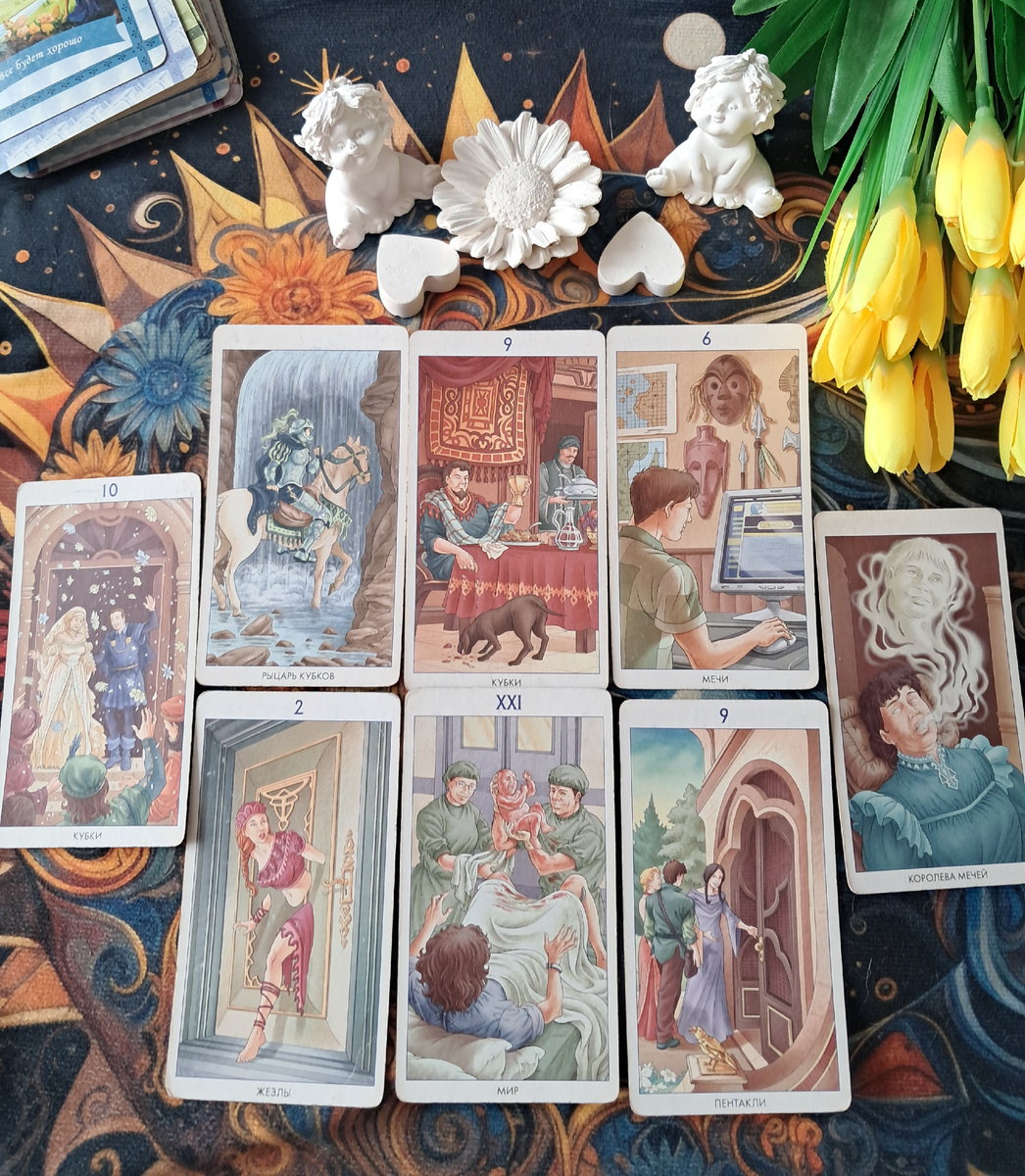 Совет: не затягивайте с решением, доверьтесь текущему предложению. Оно закрывает ваши истинные желания (9 Кубков) и открывает путь к новому, более спокойному этапу (6 Мечей, Мир).