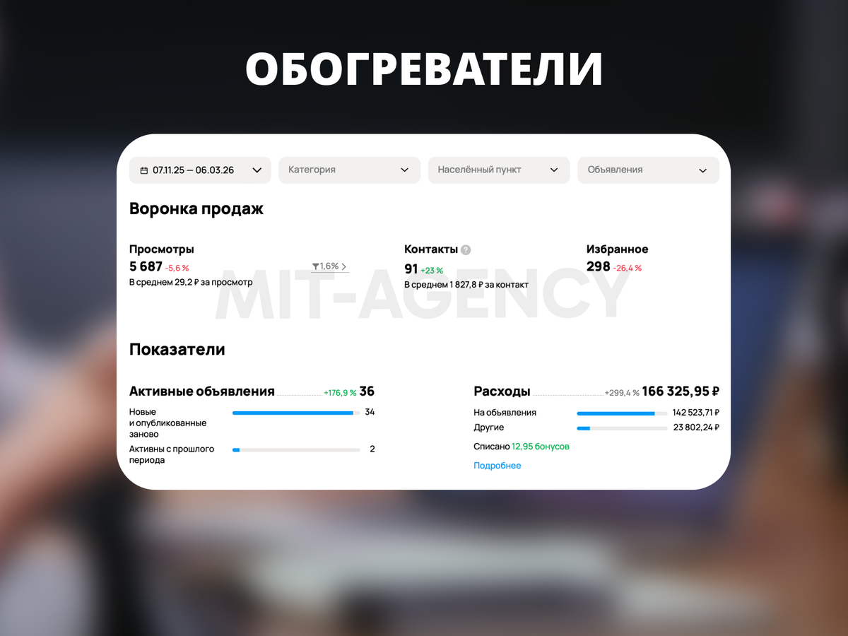 Всем привет! MIT Agency - реклама на Авито, которая приносит прибыль. Сегодня разберём кейс из ниши оборудования - инфракрасные обогреватели для больших помещений. Что вы узнаете из этого кейса - Как получать продажи дорогого оборудования через Авито