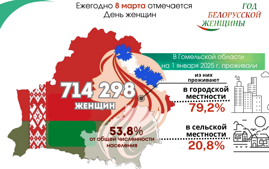 Белстат опубликовал статистический обзор к международному женскому празднику. На начало 2025 года в Гомельской области на 1000 мужчин приходилось 1 164 женщины. Всего в регионе проживает 714 298 женщин. 79,2% – в городской местности. Средний возраст жительниц области – 44,2 года. При этом в городе – 43,2, на селе – 47,9. В прошлом году в брак вступили 7 446 женщин, из них впервые – 4 438. Почти 40% невест были в возрасте от 20 до 26 лет. Средний возраст вступления женщин в брак – 26,6 года. 118 дам вступили в брак в возрасте 65 лет и старше. Уровень занятости женщин в трудоспособном возрасте на Гомельщине достаточно высокий – 84,8%. Топ-5 «женских» сфер деятельности – здравоохранение и социальные услуги (86% женщин), образование (85,3%), финансы и страхование, услуги по временному проживанию и питанию, торговля. Доля женщин-руководителей в регионе – 51,7%.