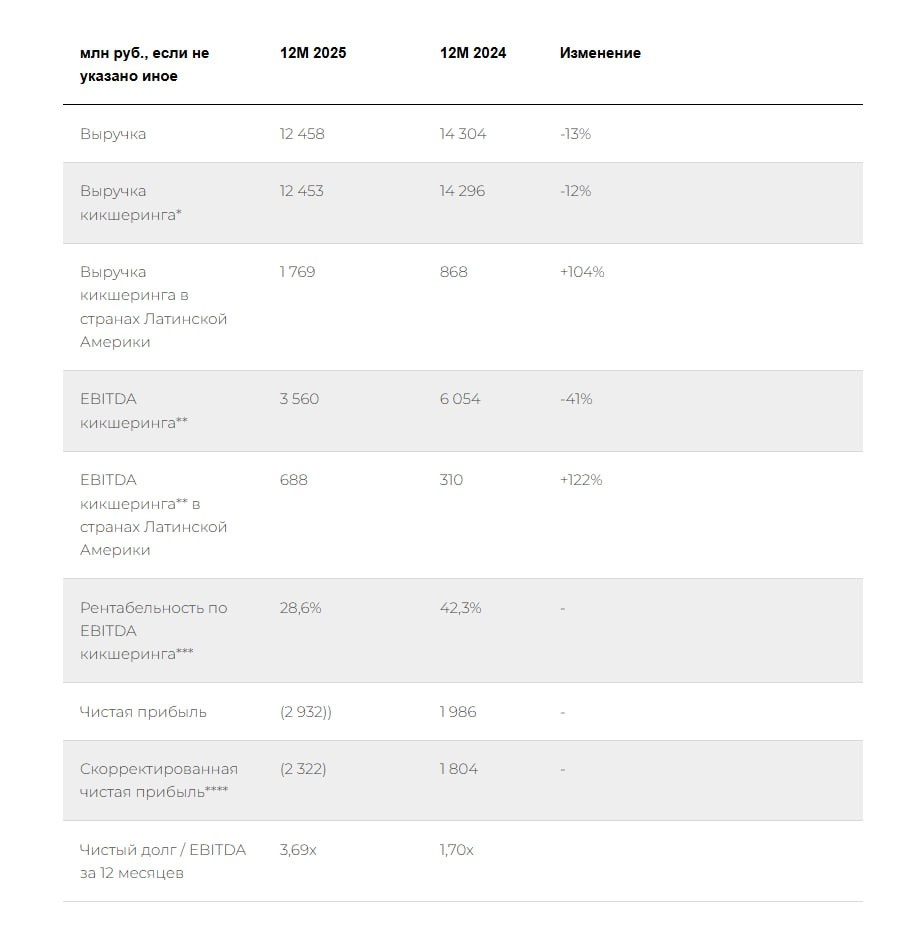 🔸 EBITDA компании упала на 41% до 3,6 млрд рублей, рентабельность по ней — 28,6%. 🔸 Чистый убыток — 2,9 млрд рублей против прибыли в 2 млрд годом ранее. 🔸 Чистый долг / EBITDA вырос до 3,69x против 1,70x годом ранее. Главный драйвер роста — Латинская Америка: 🔸 Выручка в регионе выросла на 104% до 1,8 млрд рублей. 🔸 EBITDA увеличилась в 2,2 раза до 0,7 млрд рублей. Операционные показатели: 🔸 Парк самокатов вырос на 17% до 249,7 тыс. 🔸 Количество поездок снизилось на 7% до 138,8 млн. 🔸 Число пользователей выросло на 22% до 33,7 млн. Компания завершила этап активного масштабирования и переходит к фокусу на эффективности и денежном потоке. В 2026 году Whoosh планирует снижать долговую нагрузку и максимизировать отдачу от существующего парка без закупки нового флота в РФ и СНГ. #Отчетность #WUSH Telegram | Max | Дзен