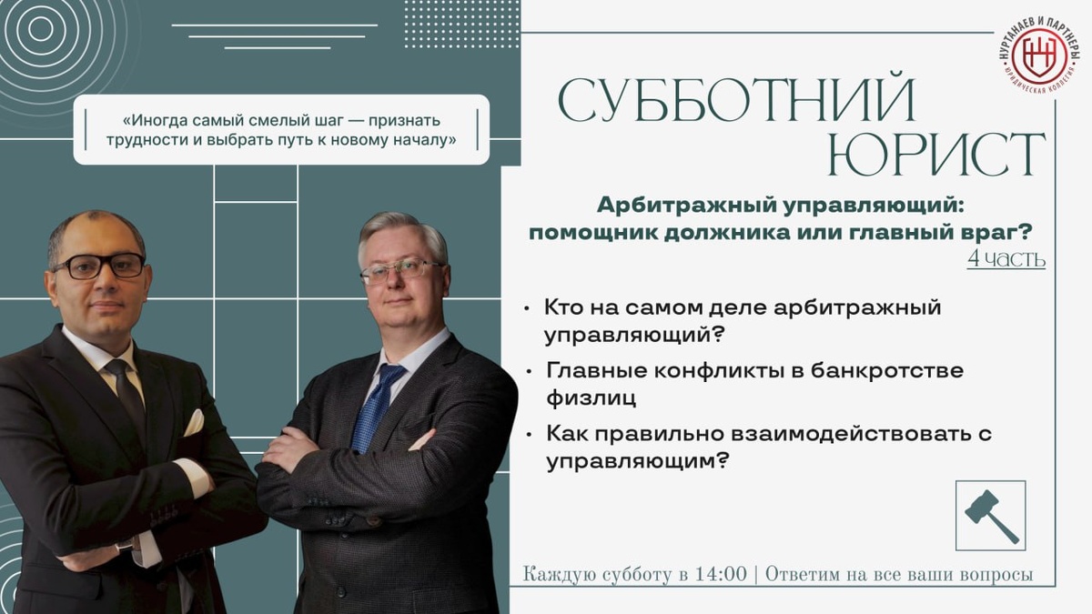 ? Об этом и о многих других вопросах мы поговорим завтра 7 марта на очередной трансляции "Субботнего Юриста" ⚖️ Эфир проведет юрист с более, чем 20 летней практикой – Шамиль Нуртанаев и Дмитрий Гладышев – юрист, арбитражный управляющий, преподаватель, Член Комиссии Росреестра по приему экзамена по Единой программе подготовки арбитражных управляющих, автор научных и научно-популярных статей по проблемам несостоятельности (банкротстве). 📝 Вот основные вопросы, которые мы обсудим в эфире: 1. Кто на самом деле арбитражный управляющий? 2. Главные конфликты в банкротстве физлиц 3. Как правильно взаимодействовать с управляющим? Также, каждый может задать свой вопрос любым удобным для вас способом, перейдя по ссылке: https://clck.ru/3ByDxh Или же просто напишите вопрос в комментариях к посту Получите юридическую консультацию, не выходя из дома! 🎥 Записи эфиров на нашем Rutube: https://rutube.ru/channel/40148985/ VK Видео: https://vk.com/video/@vk.nurtanaev Дзен: https://clck.ru/3DQGpA