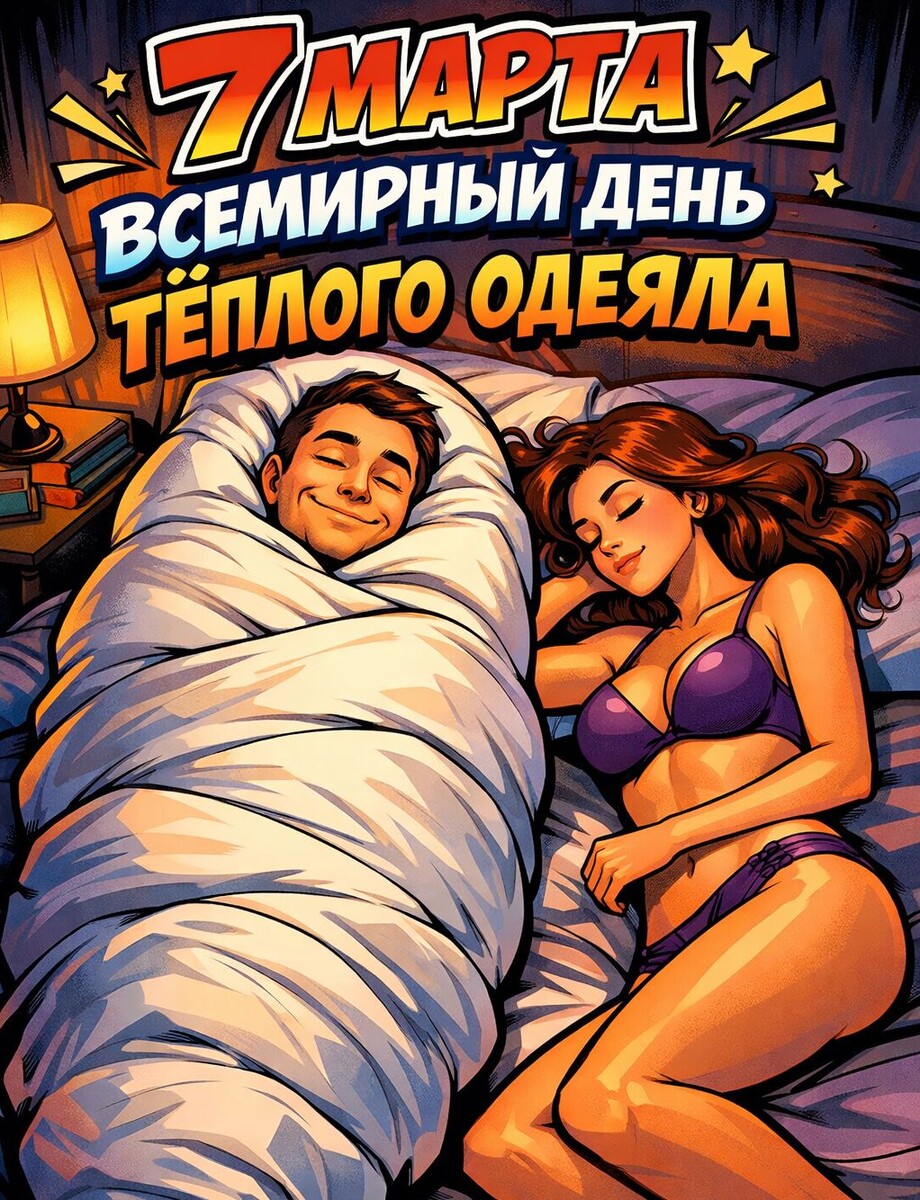 С праздником всех адептов горизонтального положения и профессиональных строителей домашних фортов - с Всемирным днем теплого одеяла! 🛌 У многих из нас с одеялом выстроены сложнейшие, почти созависимые отношения. Это ведь не просто прямоугольный кусок ткани с гипоаллергенным синтепоном. Это портативный бункер, персональный портал в безопасность, где не нужно сдавать налоговую декларацию, отвечать на письма руководства и мучительно решать, что приготовить на ужин. Мы все виртуозно владеем магией ночной терморегуляции, грациозно высовывая из-под края голую пятку, чтобы охладить внутренний реактор. А эти леденящие душу семейные драмы, когда любимый человек во сне легким движением бедра наматывает на себя всё одеяло, превращаясь в гигантскую шаурму? И вот ты уже лежишь на самом краю матраса в позе обиженного эмбриона, пытаясь согреться силой мысли и остатками гордости. 🌯 В этот день пожалуй можно признать, что ни один самый мощный экстрасенс не обладает такой исцеляющей силой, как тяжелое