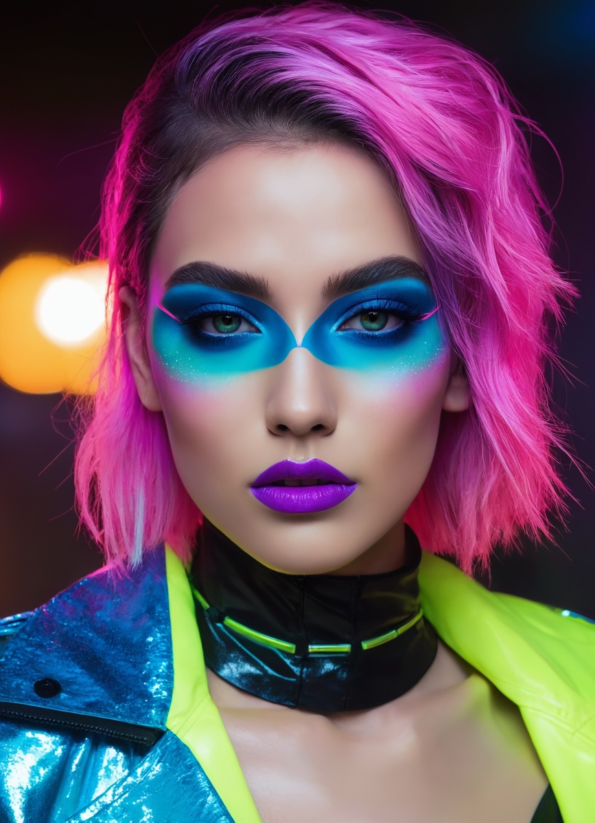 Неоновые оттенки, такие как ярко-розовый, электрик и кислотно-зеленый, идеально подходят для создания выразительного макияжа. Гладкие, глянцевые поверхности добавляют загадочности, а металлические акценты подчеркивают индивидуальность. Используя простые техники, можно создать эффектный образ, который станет отражением киберпанковского духа, где технологии и искусство соединяются в гармонии.