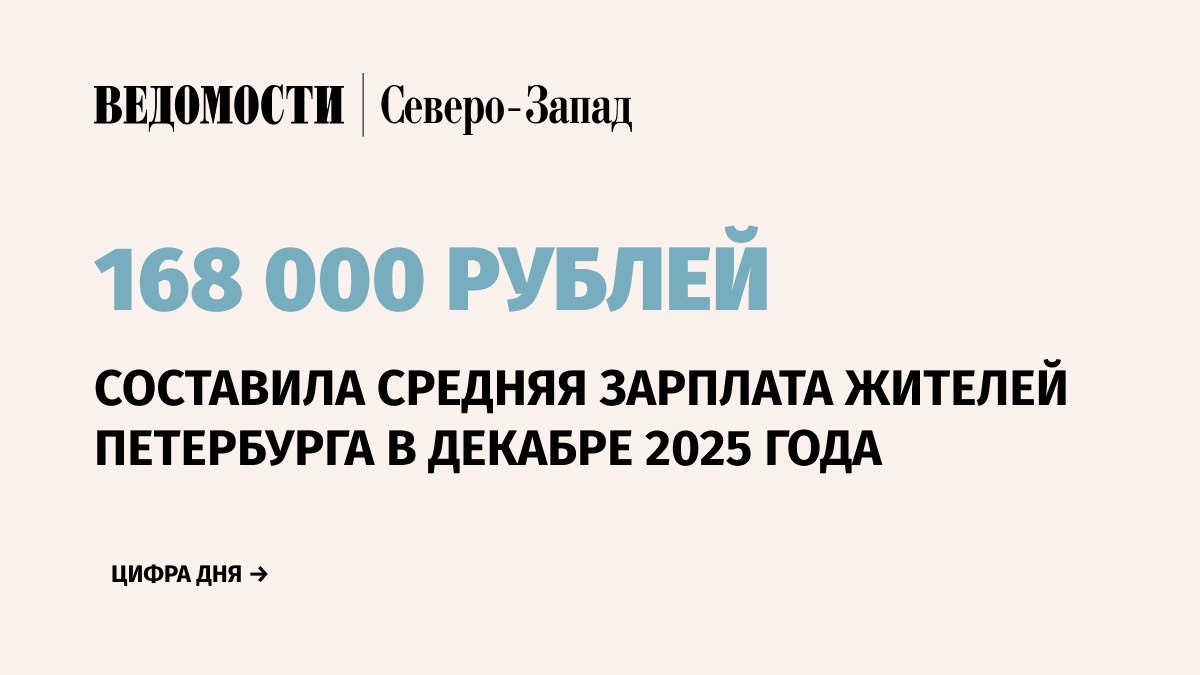 составила 168 165 руб., следует из данных Петростата. Реальный размер выплат с учетом инфляции вырос на 43,8% по сравнению с ноябрем 2025 г. и на 2,7% по сравнению с декабрем 2024 г. Максимальные зарплаты зафиксированы в добыче полезных ископаемых – 622 934 руб., что в 3,7 раза выше среднегородского уровня. Высокие зарплаты также получают: 🔷Работники водного транспорта (285 950 руб.); 🔷Воздушного и космического транспорта (335 981 руб.); 🔷Финансового сектора и страховой деятельности (311 533 руб.); 🔷Деятельности в области культуры, спорта и организации досуга (209 274 руб.). 🟩Наименьшие зарплаты в Петербурге – в деятельности гостиниц и предприятий общественного питания (77 533 руб.), деятельности почтовой связи и курьерской деятельности (77 597 руб.), предоставлении прочих видов услуг (93 747 руб.), образовании (97 086 руб.). 🗞 Telegram | 🗞 Max
