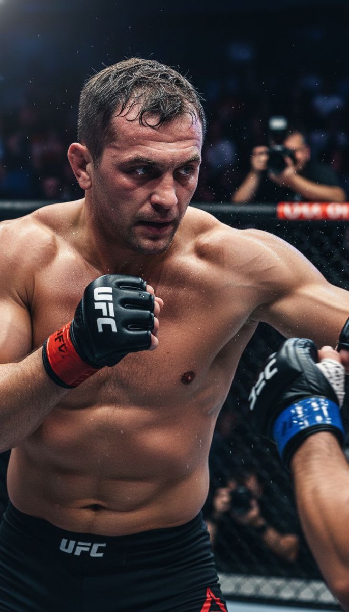 От подписчика @Androkles10. Используй прикреплëнное фото человека как референс - перенеси внешность этого человека точь-в-точь, сохраняя черты лица, форму головы, цвет волос, глаз, кожи и все уникальные особенности. Фотореалистичная спортивная репортажная фотография, 8k, ultra-detailed, динамичный момент боя ММА в клетке; крупный план по грудь, ракурс три четверти, камера на уровне глаз; взрослый атлетичный мужчина, мокрые тёмные волнистые волосы, короткая аккуратная стрижка, густые брови, сосредоточенный взгляд исподлобья; кожа влажная, капли пота и брызги в воздухе, рельефные мышцы груди, плеч и рук; правая рука поднята для блока, согнутый локоть, левая сжатая в чёрной ММА‑перчатке; на правом краю кадра — рука соперника и перчатка с лёгким motion blur; фон — затемнённая арена и публика за размытой сеткой клетки, фотографы на фоне; жёсткий верхний свет и холодный контровый rim light, блики на коже; малая глубина резкости, красивое боке; натуральные тона кожи, чёткая текстура пор, кап
