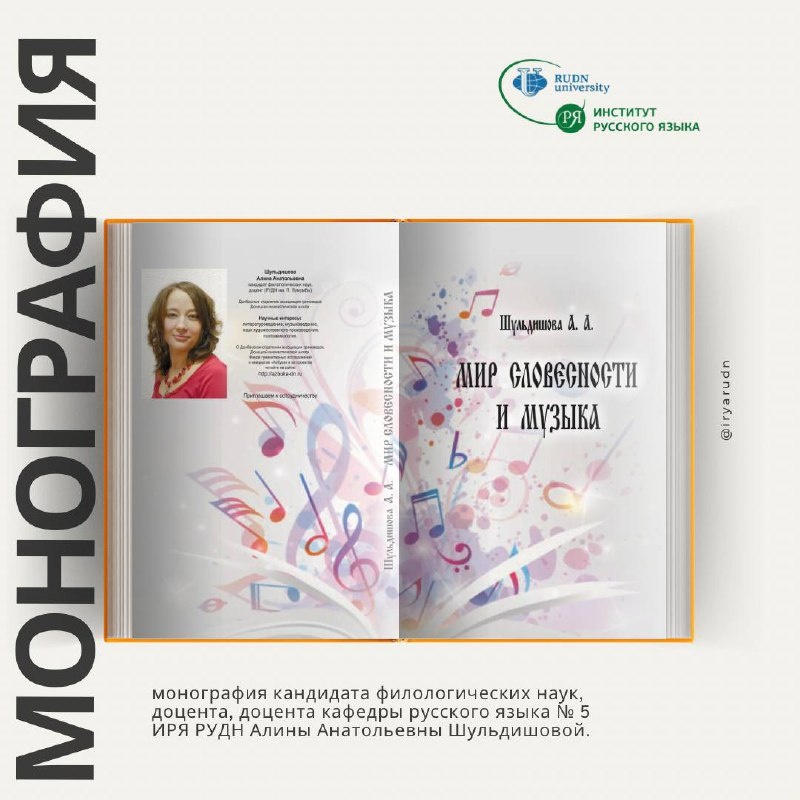 » ☺️ Опубликована новая монография кандидата филологических наук, доцента, доцента кафедры русского языка № 5 Института русского языка РУДН Алины Анатольевны Шульдишовой. 📖 В книге рассматривается проблема взаимодействия Слова и Музыки в художественном тексте. Автор анализирует особенности идиостилей и индивидуальных языковых систем писателей, выявляя способы и средства «омузыкаливания» слова в русской литературе. 🎼 Монография построена по принципу своеобразной симфонической структуры: каждому разделу предшествует краткое abrégé, которое задаёт ключевые ориентиры для чтения. 🔍 В центре анализа: произведения Александра Блока, Ильи Сельвинского и Александра Грина, демонстрирующие выразительный синтез словесных и музыкальных образов. 🔗 Ссылка на полный текст #КРЯ5 #Монография