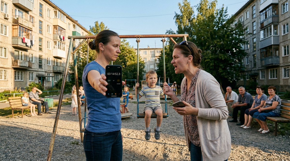 Женщина стояла у качелей, телефон в руке. На экране — секундомер. Три минуты двенадцать секунд.