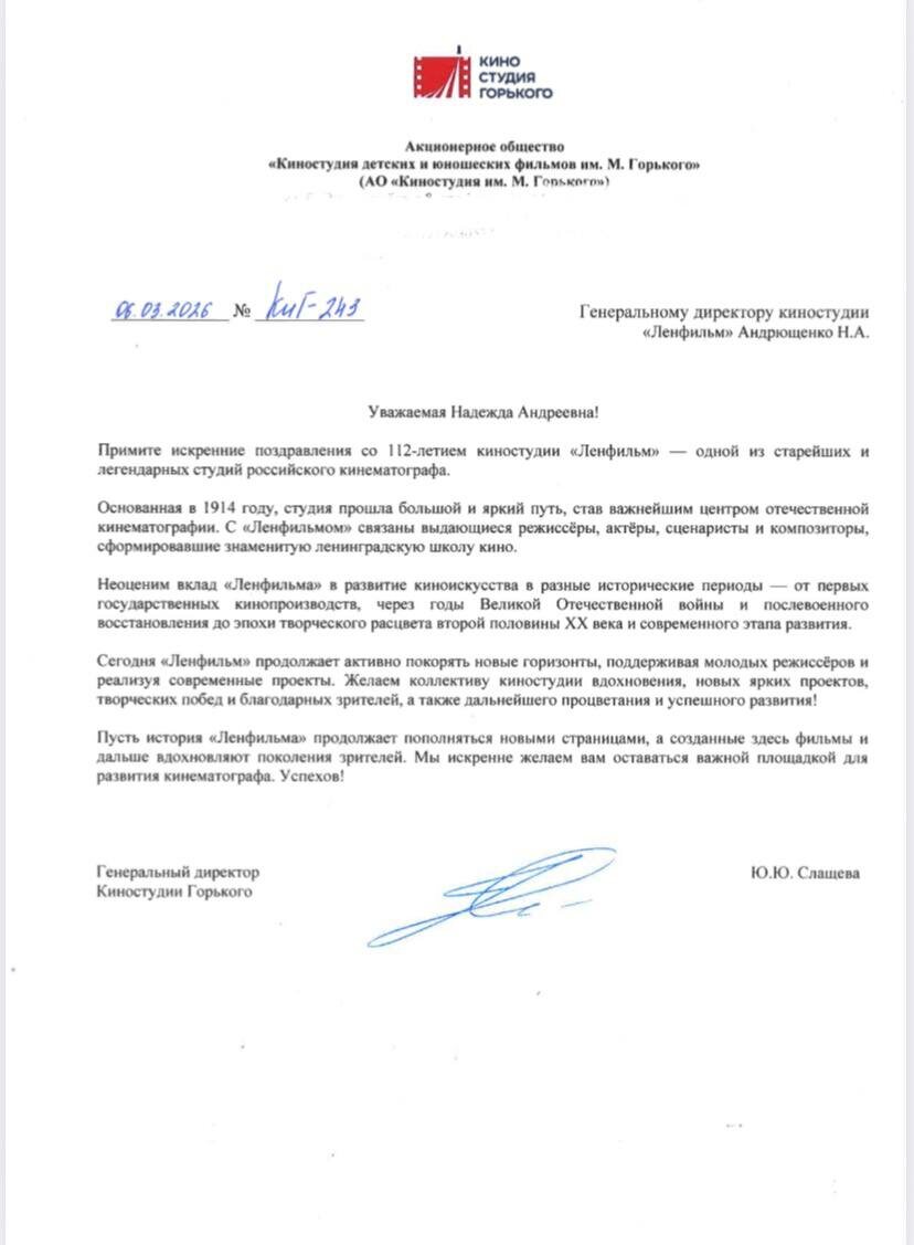 Киностудия «Ленфильм» получила более 40 поздравлений с Днем рождения от наших друзей и партнеров в индустрии