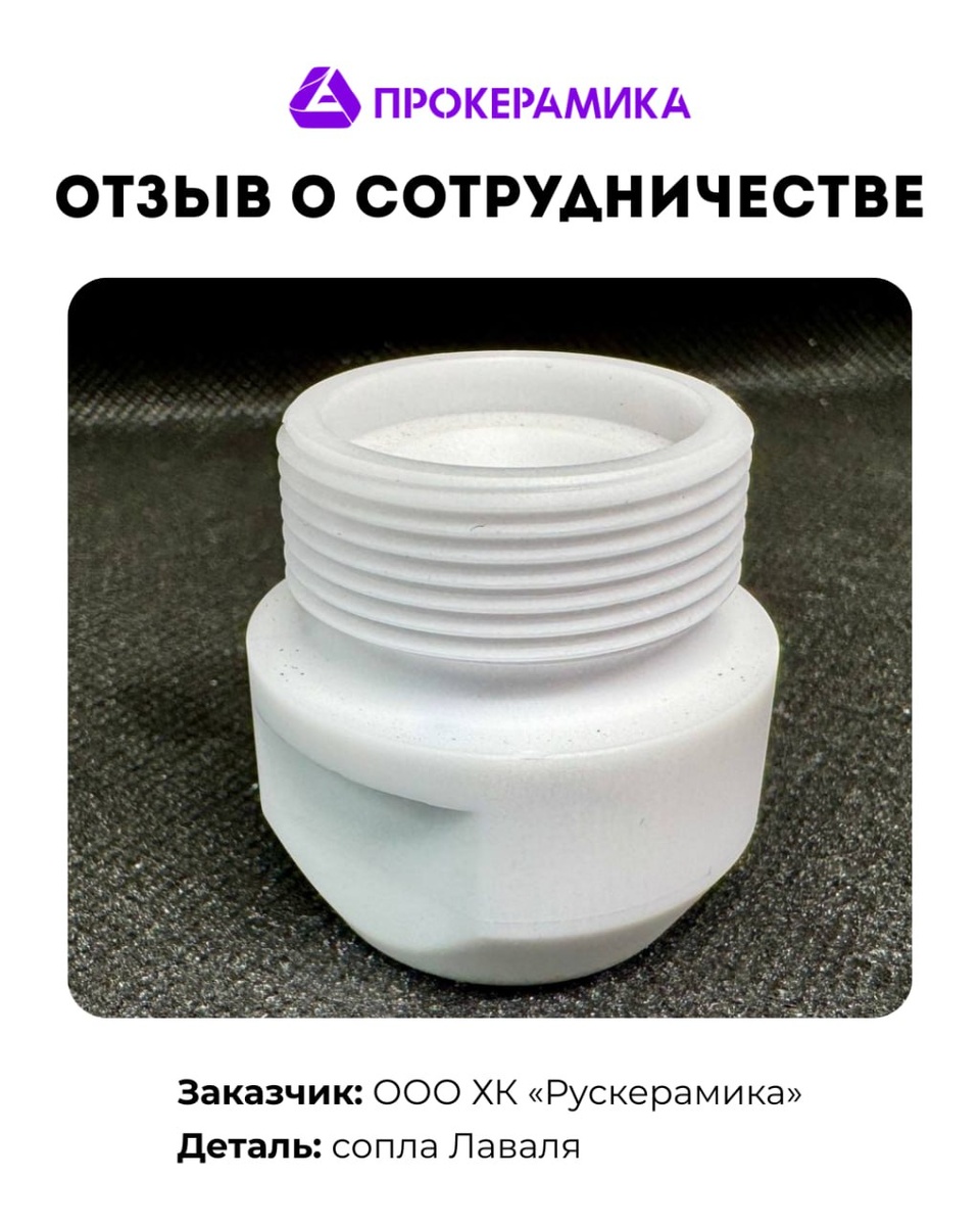 ». В ней мы будем делиться реальными историями клиентов, их впечатлениями от работы с нами и результатами проектов. Отзыв от нашего партнера💬 Руководитель отдела снабжения ООО ХК «Рускерамика» Николаев Дмитрий Сергеевич "Очень хочется наконец поделиться впечатлениями от работы с компанией «Прокерамика». Мы пришли к ним с, мягко говоря, непростым заказом: требовалось воссоздать копию зип-запчасти для немецкого оборудования — точнее, сопла Ловаля со сложнейшей внутренней параболической поверхностью. Честно говоря, не все верили, что это можно качественно повторить. Но команда «Прокерамика» доказала обратное. Результат оказался колоссально положительным! Деталь выполнена с ювелирной точностью. Отдельное спасибо за техническую поддержку: нас не оставляли без обратной связи ни на одном этапе — от обсуждения 3D-модели до финальной печати. И, что приятно удивило, сроки выдержали, хотя работа была явно штучная и сложная. Уже пол года деталь успешно служит нам. Теперь буду знать, куда обр