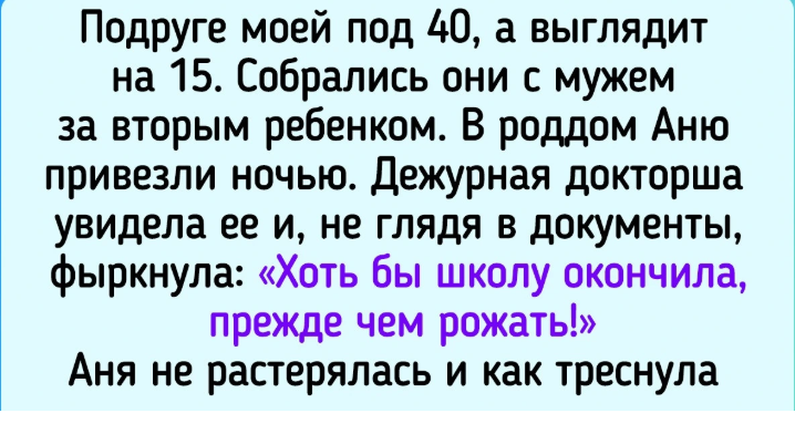 - Подруге моей под 40, а выглядит на 15. Собрались они с мужем за вторым ребенком. В роддом Аню привезли ночью. Дежурная увидела ее и, не глядя в документы, фыркнула: «Хоть бы школу окончила, прежде чем рожать!» Аня не растерялась и как треснула кулаком по столу, а потом спокойно сказала: «Я уже институт 2 раза окончила, в администрации работаю, а вы все еще читать не научились? Мне 39, это вторые роды». Доктор глянула в документы, потом на Аню, извинилась и дальше была с ней тише воды ниже травы.