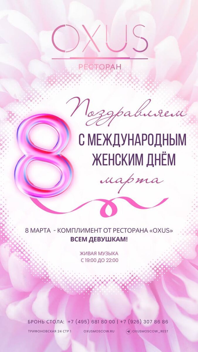 !🌹 8 МАРТА: 🌸С 12:00 до 00:00 - всем прекрасным леди - комплимент от ресторана OXUS! 🌸С 19:00 до 22:00 - ужин под живую музыку от дуэта OLGA MARCHENKO & IVAN RYABKOV 🌸Бронь столика без депозитной системы! Подарите себе красивый праздник в OXUS! Бронь по тел. / в лс: Ресторан OXUS +7(495) 681 80 00 +7(926) 307 86 86 (TG) Сайт, telegram