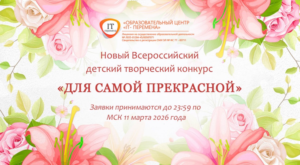! В преддверии самого нежного праздника мы объявляем творческий конкурс «Для самой прекрасной»! Мы знаем, что лучший подарок — тот, что сделан с любовью своими руками. Пусть в этот раз открытка не будет куплена в магазине, а букет не завянет на следующий день. Нарисуйте портрет самой красивой мамы на свете. Смастерите для бабушки открытку с объёмными тюльпанами или бумажную мимозу. Сфотографируйте праздничный пирог, который вы испекли вместе с папой, или трогательную поделку из пластилина. Присылайте рисунки, аппликации, фото самодельных букетов и снимки утренников в детском саду. Пусть в каждой работе живёт весна, звенит капель и светится главное волшебство — любовь к самым прекрасным женщинам! Электронные наградные документы - бесплатно! Заявки принимаются до 11 марта 2026 года включительно. Ссылка на конкурс: https://itperemena.ru/prekras