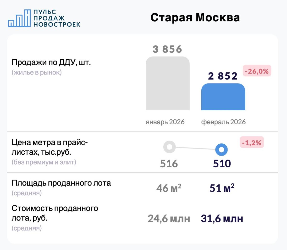Февраль 2026. Итоги продаж по ДДУ. 🏙 Сделки 2 852 сделок по ДДУ в феврале 2026 (-26,0% за месяц). 💰Цены и предложение На конец февраля средняя цена метра составила 510 тысяч рублей (-6 000 рублей за метр, без премиум и элит сегментов). На начало марта (на сегодня) средневзвешенная цена метра растёт, 513 тысяч рублей. 🔸Цена метра в сделках с ДДУ выросла до 489 тысяч рублей (+3 тыс. рублей, +0,5%). Средний бюджет покупки вырос, в среднем 31,6 млн рублей за лот (+7,0 млн за месяц). Средняя площадь проданного по ДДУ лота в феврале - 51 м² (+5 м² за месяц). 📈 Доля ипотечных сделок 56,0% (в январе было 70,0%). Смотрите детальные графики, топ девелоперов и старты продаж февраля на нашем сайте https://pulsprodaj.ru/news/fevral-2026-moskva-staraia/ 🔥 @pulsprodaj
